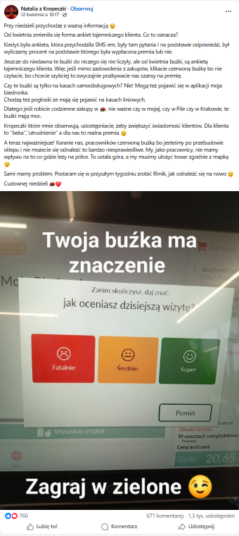 „Jeśli mimo zadowolenia z zakupów, klikacie czerwoną buźkę bo nie czytacie, bo chcecie szybciej to zwyczajnie pozbywacie nas szansy na premię. (…) Dla klienta to 'beka’, 'utrudnienie’, a dla nas to realna premia 😉”