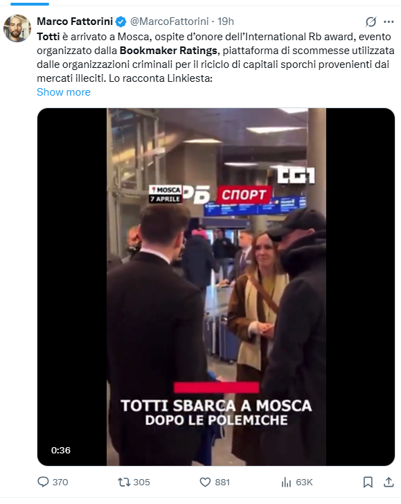 Mimo apeli polityków i oburzenia opinii publicznej, Francesco Totti poleciał do Moskwy. Legenda AS Roma wystąpi dziś jako gość specjalny na gali rosyjskiego portalu bukmacherskiego!
