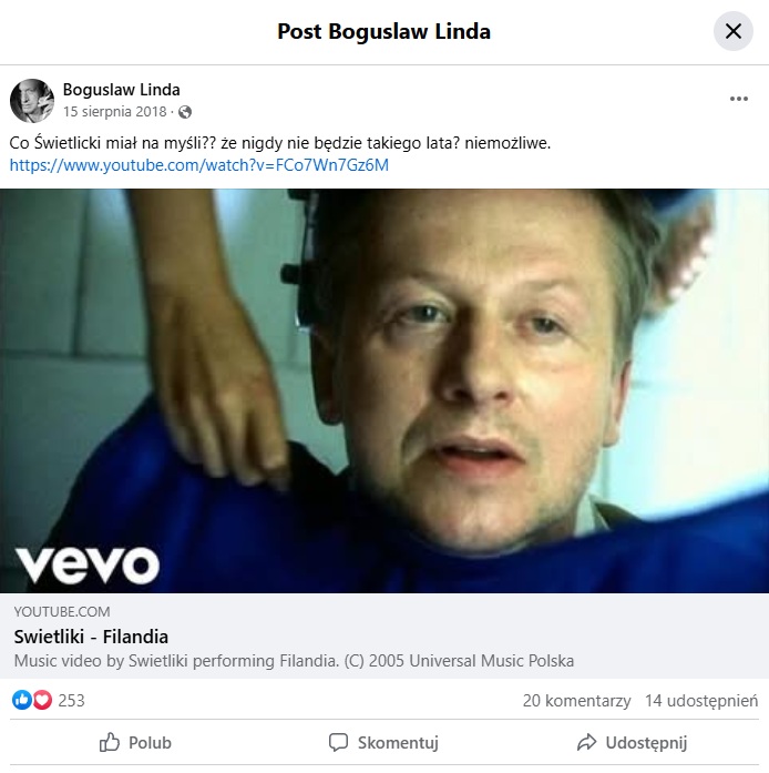 Gdy Bogusław Linda recytuje słowa w piosence zespołu Świetliki, słychać w nich coś więcej niż tylko aktorską interpretację. Jego głos, zmęczony i pełen dystansu, doskonale komponuje się z melancholijną atmosferą utworów grupy. Świetliki od lat snują opowieści o końcu pewnego świata, a Linda nadaje im ton apokaliptycznej przestrogi.