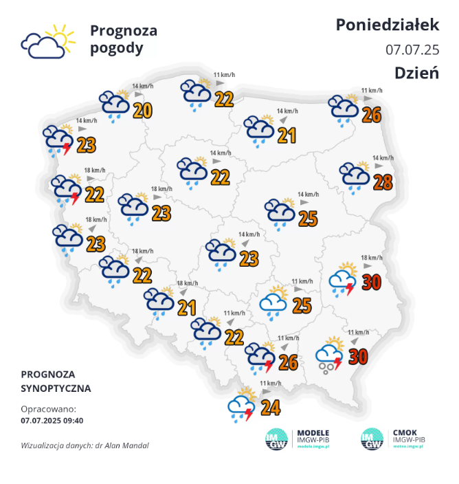 Pogoda na poniedziałek, 8 lipca 2025 – prognoza dzienna z podziałem na regiony wg. IMGW