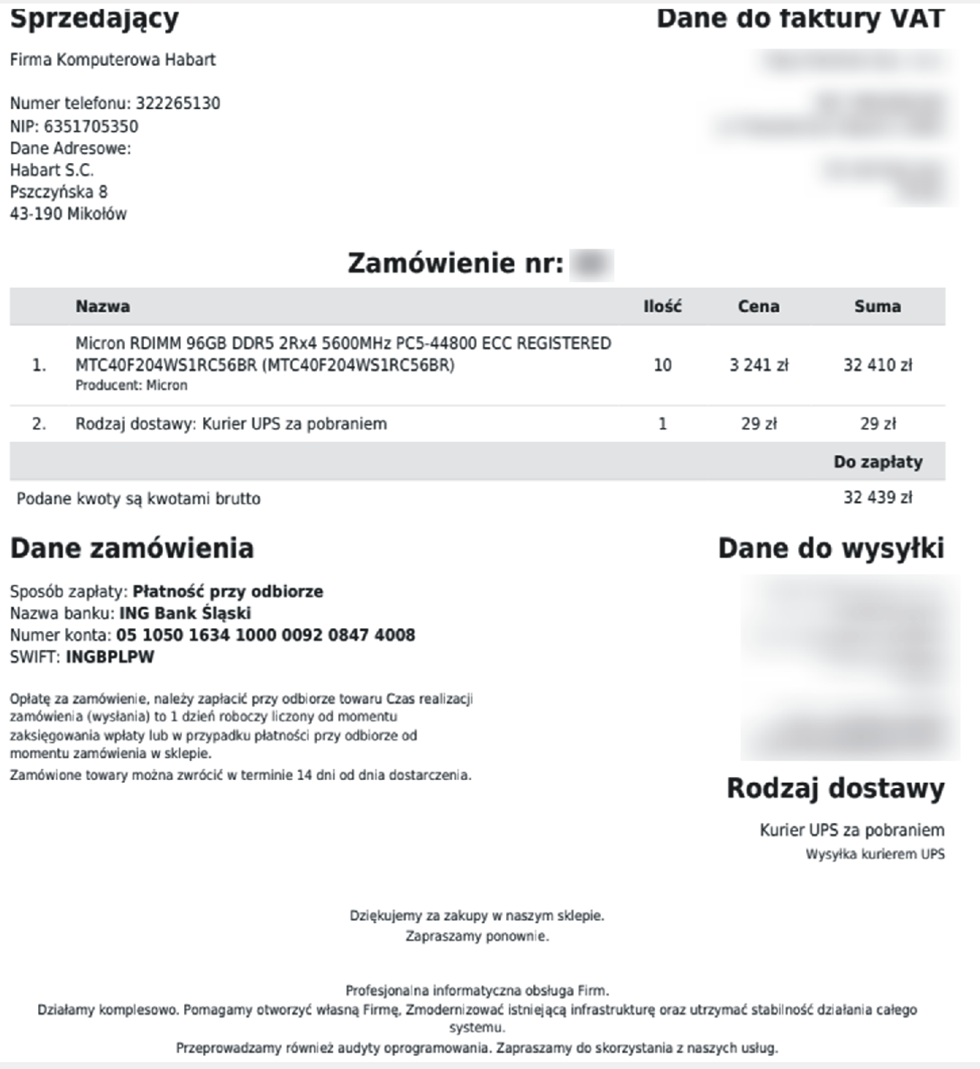- 24.11.2025, ok. 14:50 – Klient składa w sklepie Habart.pl. Przedmiot: 10 sztuk modułów pamięci Micron 96GB DDR5 RDIMM (pamięć do komputera). Cena jednostkowa oferowana na stronie: 3 241 zł brutto. Łączna wartość zamówienia (z dostawą 29 zł): 32 439 zł brutto.