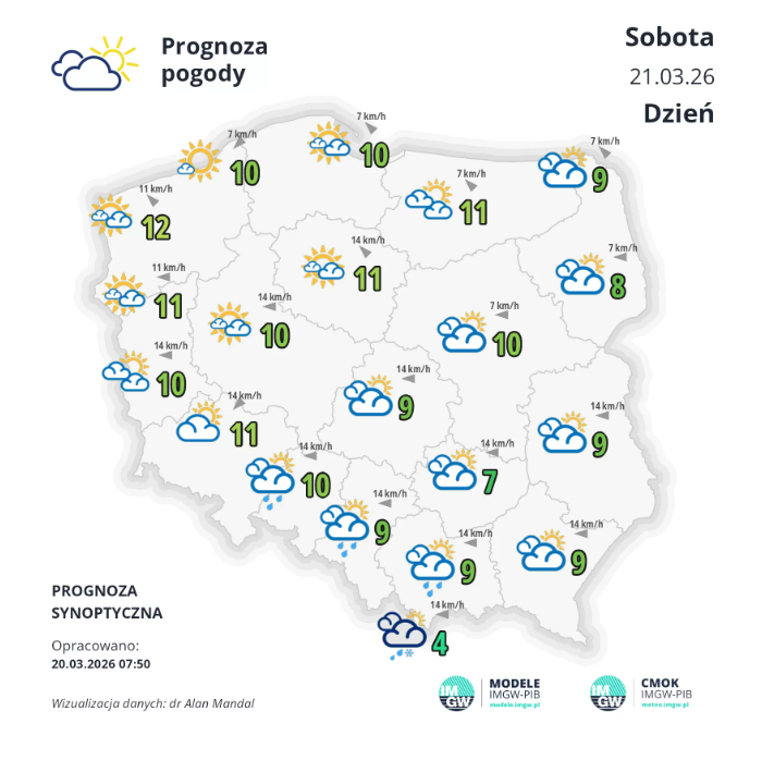 Pierwsze dni wiosny zaserwują nam zmienną aurę, która wymaga przygotowania na różne warunki atmosferyczne. Piątek przyniesie duże zachmurzenie z przejaśnieniami. Dodatkowo, okresowe opady deszczu wystąpią w wielu regionach kraju. Termometry wskażą od 6°C na północnym wschodzie do nawet 12°C na południu Polski. Natomiast noc z piątku na sobotę przyniesie przymrozki do -4°C na północy oraz mgły ograniczające widzialność do 200 metrów.